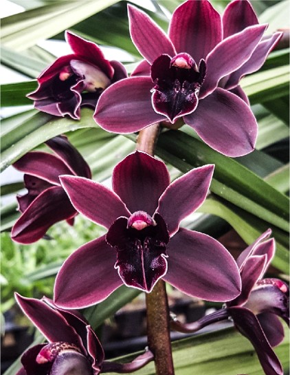 From mid-November to mid-February, the white Ice Cascade Cymbidium is available. From December to February the rest of their Cascade Cymbidium assortment is available in colours ranging from pink, purple, burgundy, to yellow and green.